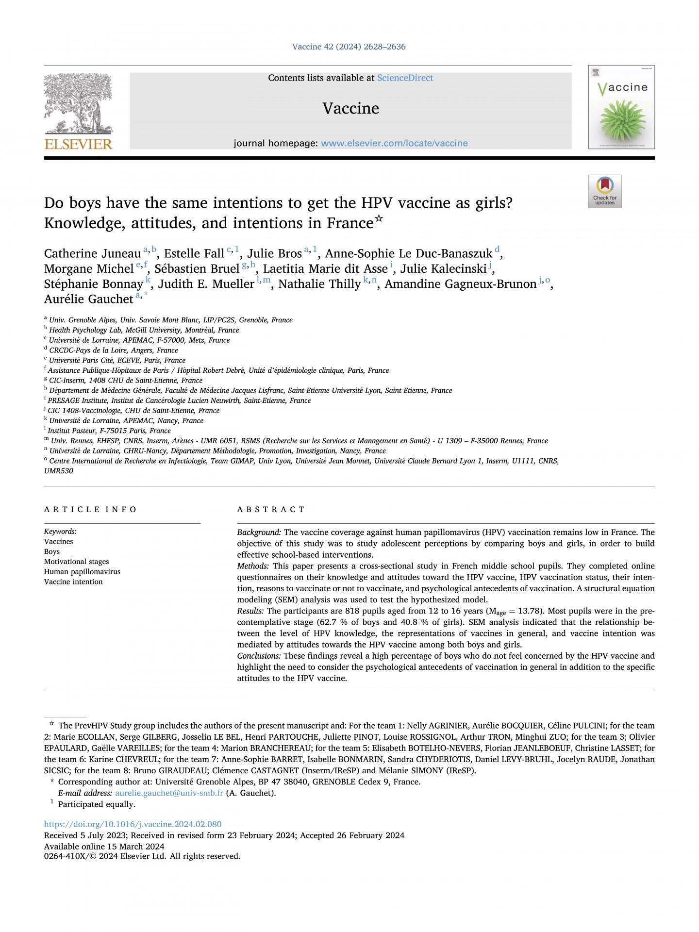 Do boys have the same intentions to get the HPV vaccine as girls? Knowledge, attitudes, and intentions in France
